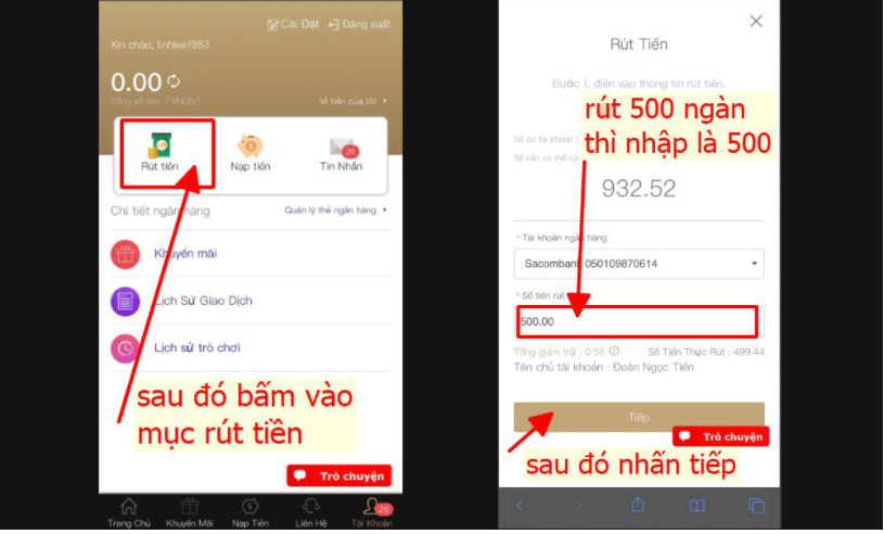 Bước 2: Trờ về bấm vào mục rút tiền như hình sau đó nhập số tiền muốn rút, ví dụ trong tài khoản quý khách còn 1 triệu và muốn rút 500 ngàn thì nhập số tiền rút là 500